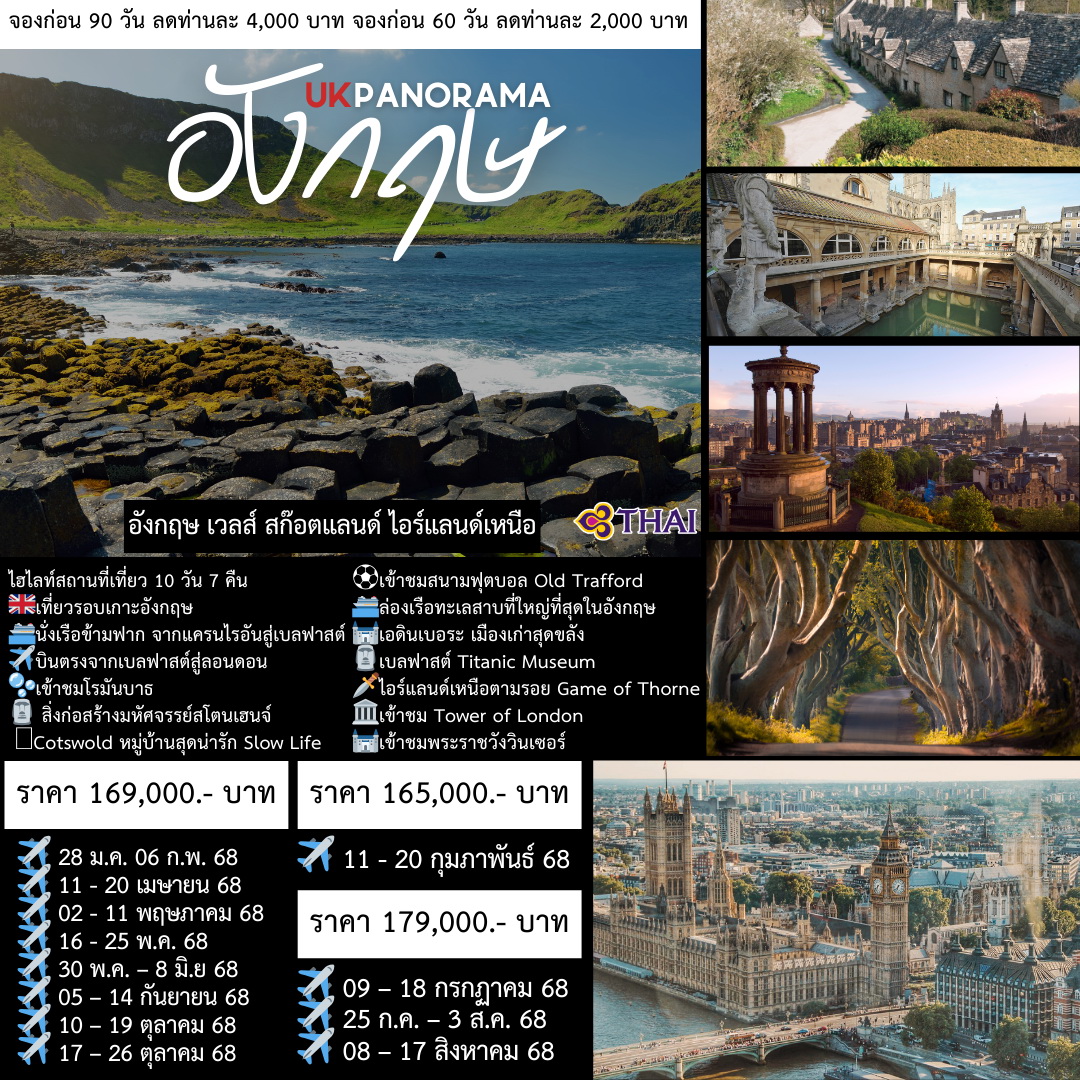 -เอดินเบอระ (สก๊อตแลนด์) - คาล์ตัน ฮิลล์ - เข้าชมปราสาทเอดินเบอระ -ชมเมือง – นิวคาสเซิล - ยอร์ก – ชมเมือง – ชมทะเลสาบวินเดอร์เมีย -เพรสตัน – แมนเชสเตอร์ – เข้าชมสนามแมนยูไนเต็ด - ลิเวอร์พูล – ชมเมือง -เบอร์ตัน ออน เดอะ วอเตอร์ - หมู่บ้านไบบูรี – ฟาร์มปลาเทราท์ – คาร์ดิฟ/บริสทอล -บาธ – เข้าชมสโตนเฮนจ์ - ลอนดอน - ล่องเรือแม่น้ำเทมส์ - หอคอยลอนดอน -ชมเมือง – ถ่ายภาพหอนาฬิกาบิ๊กเบน – ช้อปปิ้งย่านอ๊อกซ์ฟอร์ด -ลอนดอน – แฮรรี่ พ็อตเตอร์ สตูดิโอ ทัวร์(Harry Potter) – ช้อปปิ้งย่านไนท์บริดจ์ -ช้อปปิ้งบิสเตอร์ เอาท์เล็ท -เมนูพิเศษ Fish & Chip -เมนูเป็ดย่างรสเลิศและกุ้งมังกร (เด็ดที่สุดในร้าน) 4 ดาว